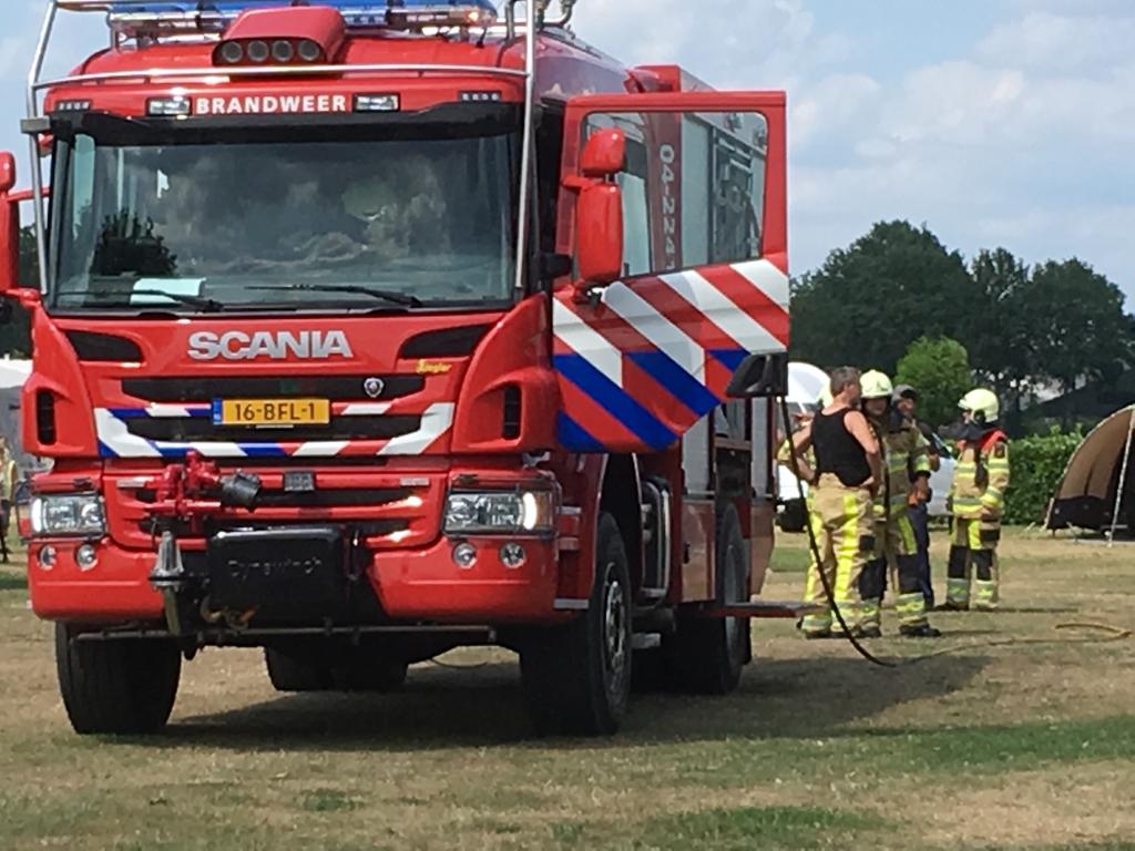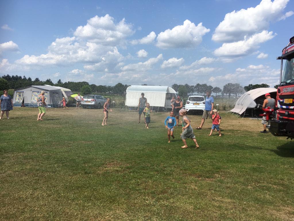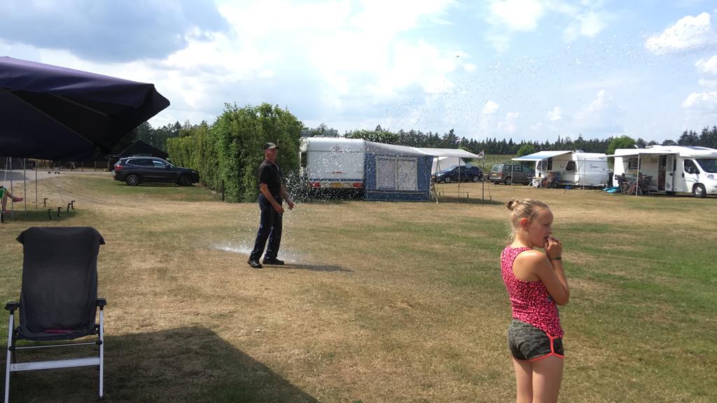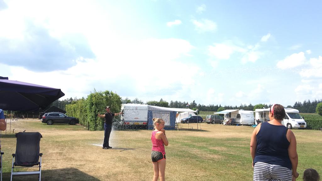 Ondertussen ligt de accu af te koelen in een kruiwagen met grondwater en is de rust weer teruggekeerd op de camping. Ooit zei de Brandweer ons dat de ruimte tussen kampeermiddelen minimaal 5 meter moet zijn en daar houden we ons altijd aan. Vandaag bleek maar weer eens hoe belangrijk dat kan zijn, maar ook hoe belangrijk gasten zijn die direct in actie komen en hoe fijn het is dat wij zo’n goede vrijwillige Brandweer hebben in Ommen.