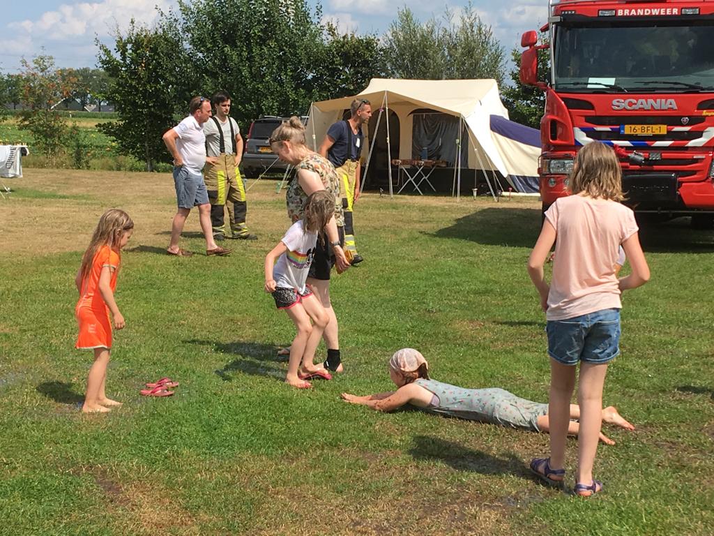 De Brandweer wist de accu gelukkig snel te koelen en daardoor was alles binnen de kortste keren weer onder controle. Gezien de warme omstandigheden bleef de waterpret niet lang uit. (Boys blijven toch boys) Ook boer Hendrik-Jan kon niet achterblijven en haalde een flink nat pak. Na een kop koffie vertrokken de heren met een doosje eieren van onze kippen weer naar de kazerne.